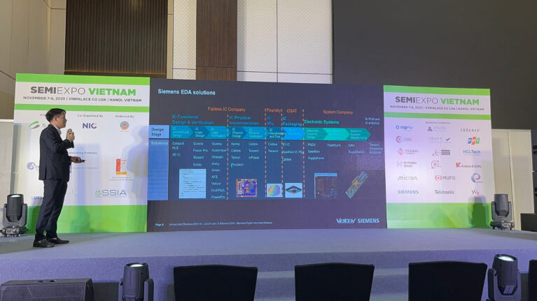 Cao Văn Lanh – Phó Giám đốc Vietbay giới thiệu Các giải pháp công nghệ của Siemens hỗ trợ thiết kế, xác minh và thử nghiệm bán dẫn tại phiên chuyên đề Techstage tại SEMIEXPO Vietnam 2025.