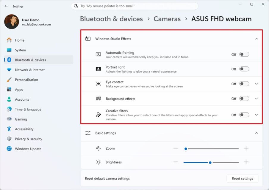 Bạn có thể bật các tính năng này tại Settings > Bluetooth & devices > Cameras, sau đó mở phần thuộc tính của camera và bật các tùy chọn “Advanced camera options” và “Use Windows Studio Effects”.
