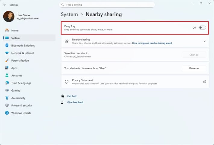 Bạn có thể tắt Drag Tray tại: Settings > System > Nearby Sharing.