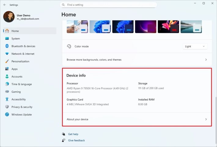 Trên trang Home của ứng dụng Settings, sau khi cài đặt bản cập nhật này, bạn sẽ thấy một thẻ mới có tên “Device info”, hiển thị các thông số kỹ thuật quan trọng của máy tính, bao gồm bộ xử lý (CPU), dung lượng lưu trữ, bộ nhớ (RAM) và thông tin card đồ họa (GPU).